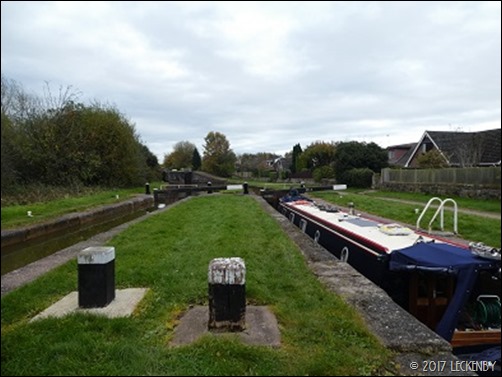 I walked down and had to lift a paddle as the lock had started to leak and the level had dropped. Back up to let Mick out and then leapfrogging him to the chamber below. I thought of mentioning about the paddle still being up, but he always notices. When I returned to lift the second paddle Oleanna had only dropped half way and wasn’t getting any lower. Oops! He hadn’t seen the paddle and was wondering why he was being dragged backwards in an emptying lock. Luckily for those following us the short pound above had only dropped a bit and the by wash was doing it’s best to refill it, so it would recover quickly.